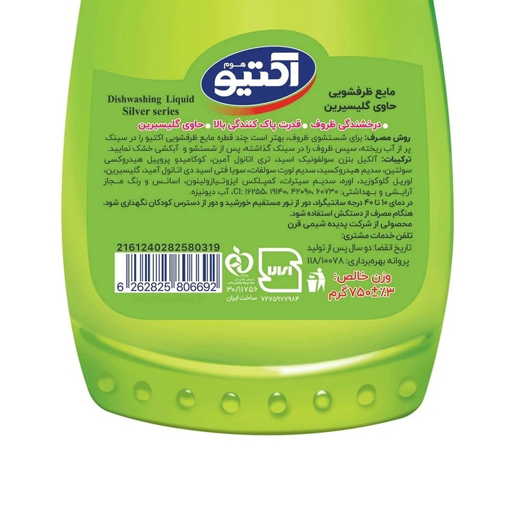 امکانات و ویژگیهای شوینده: لکه زدایی , چربی زدایی , جرم زدایی , براق کنندگی , عدم آسیب به ظروف , از بین برنده بوی نامطبوع , قدرت پاککنندگی بالا , غلظت مناسب , رایحه دلپذیر و ماندگار , از بینبرنده ذرات به جا مانده غذا بر روی ظروف
