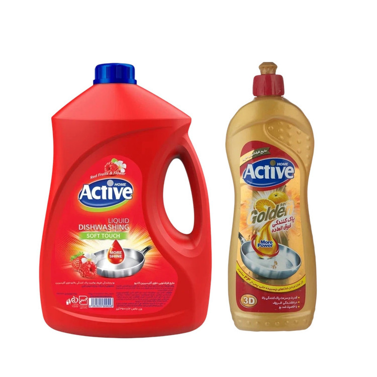 این پک دو عددی اقتصادی مایع ظرفشویی اکتیو شامل مایع ظرفشویی اکتیو سری Golden مدل Orange وزن ۷۵۰ گرمی به همراه مایع ظرفشویی اکتیو مدل Red fruits and flower وزن ۳۵۰۰ گرمی است.